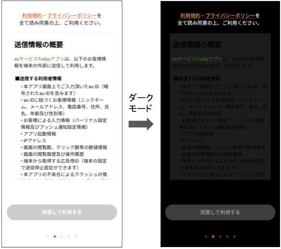 「auサービスToday」で targetSDK バージョンを 33 にしたところ、アプリの WebView がダークモードに切り替わらない事象が発生しました。例えば、下記の利用規約画面では利用規約の部分を WebView で表示していますが、その WebView がダークモードに切り替わりませんでした。