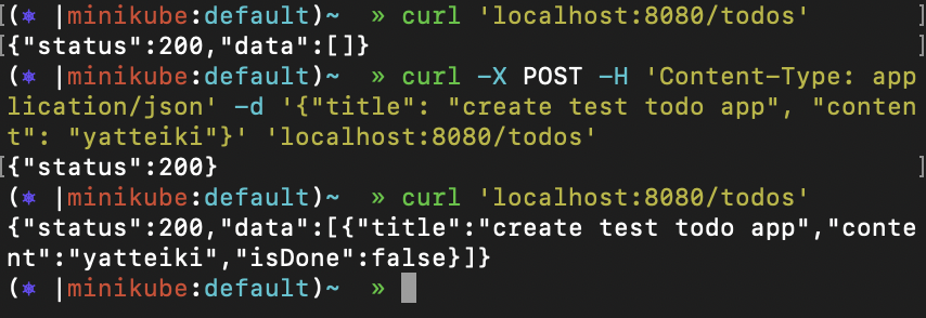 curlでリクエストを投げたところ、無事レスポンスが返ってきました!(TODOを作成するエンドポイントも実装しています)