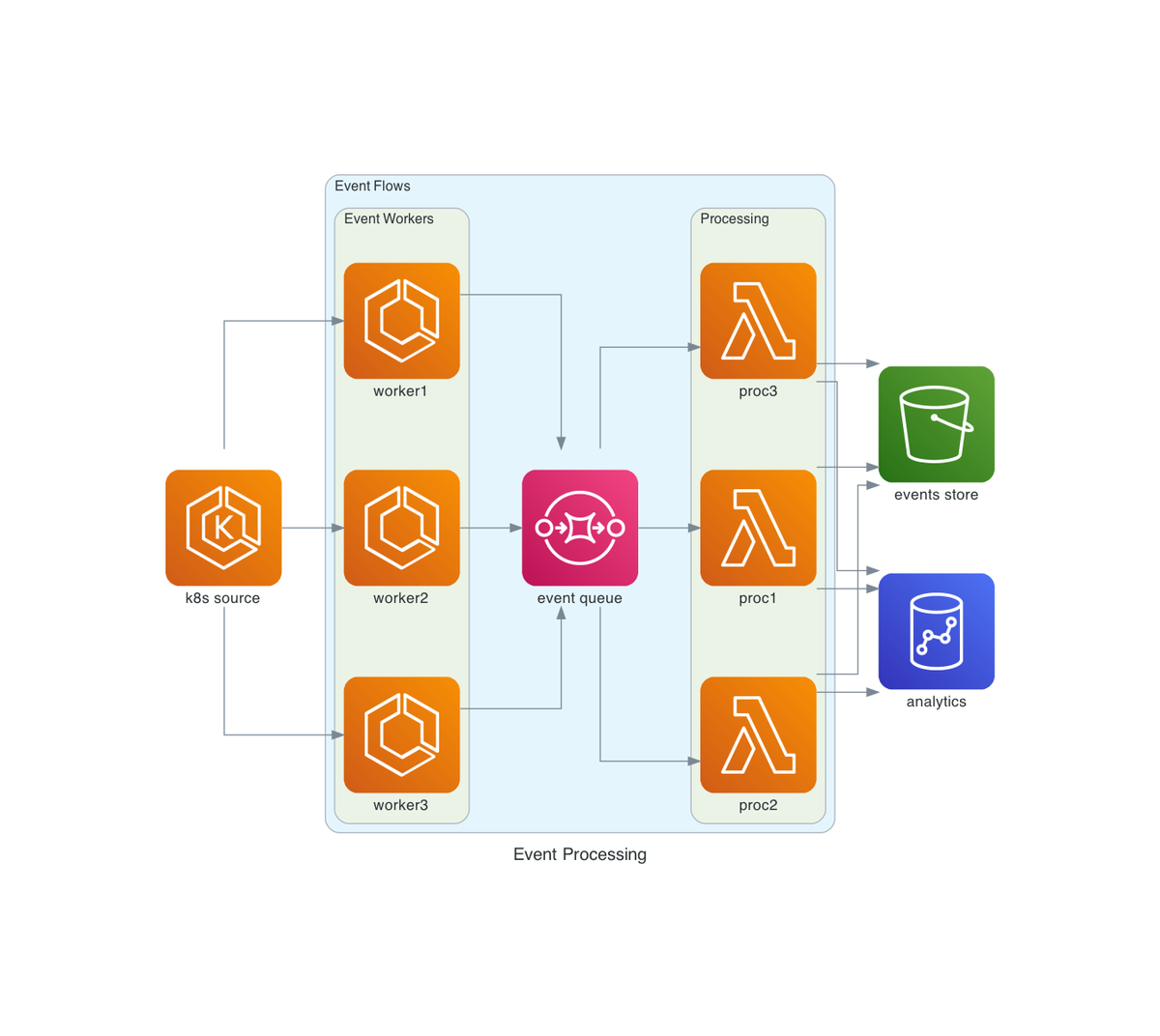 from diagrams import Cluster, Diagram from diagrams import Edge from diagrams.aws.compute import ECS, EKS with Diagram("Event Processing", show=False) as diagram: source = EKS("k8s source") with Cluster("Event Flows"): a = ECS("A") b = ECS("B") c = ECS("C") d = ECS("D") source >> a source >> b source >> c source >> d if __name__ == '__main__': diagram