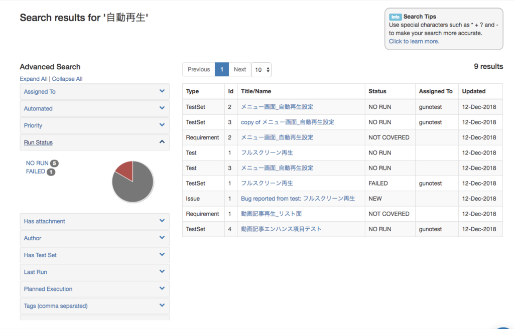 要件、テストケース、issueの検索ができるのですが、検索結果のAdvanced Searchからさらなる絞り込みが可能です。